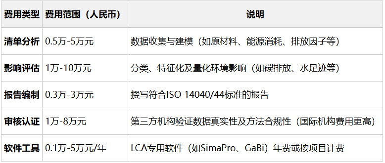 LCA费用因评估范围、产品复杂度、数据深度及机构资质差异显著,主要分为以下部分: