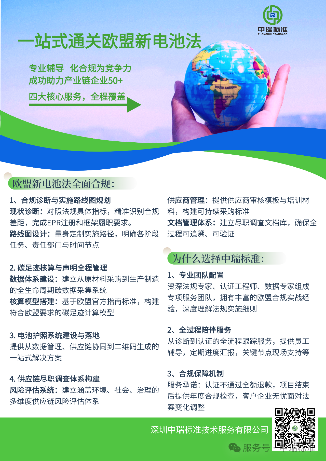 中瑞标准作为专业的合规辅导机构,凭借对欧盟电池法规的深度理解和丰富实践经验,为电池产业链企业提供一站式合规解决方案。从法规解读、差距分析、体系搭建到认证支持,我们全程陪伴企业顺利完成合规之旅,将合规压力转化为市场竞争优势。如果你有欧盟电池法规相关合规需求,欢迎联系我们!