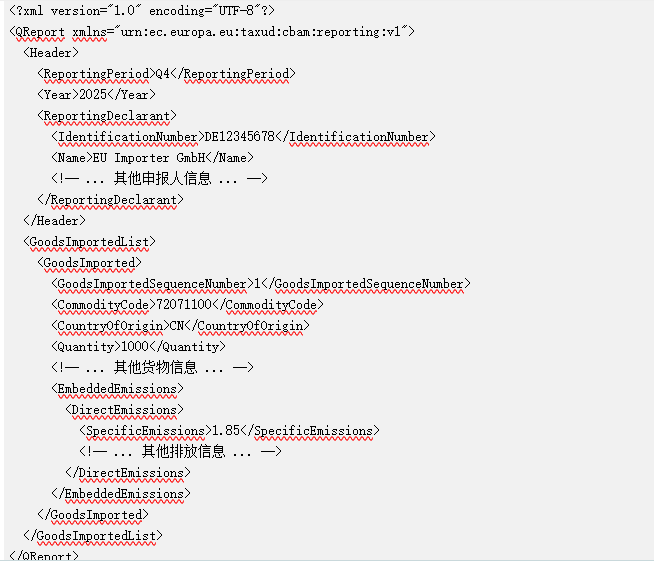 主要的XSD文件包括 `QReport_ver23.00.xsd` 和 `stypes.xsd`,它们详细规定了报告中每个数据元素(如`ReportingDeclarant`、`GoodsImported`、`EmbeddedEmissions`等)的结构和格式。欧盟还在官方网站上提供了包含代码列表和字段说明的Excel格式报告结构文件,帮助开发者和技术人员理解并构建正确的XML。