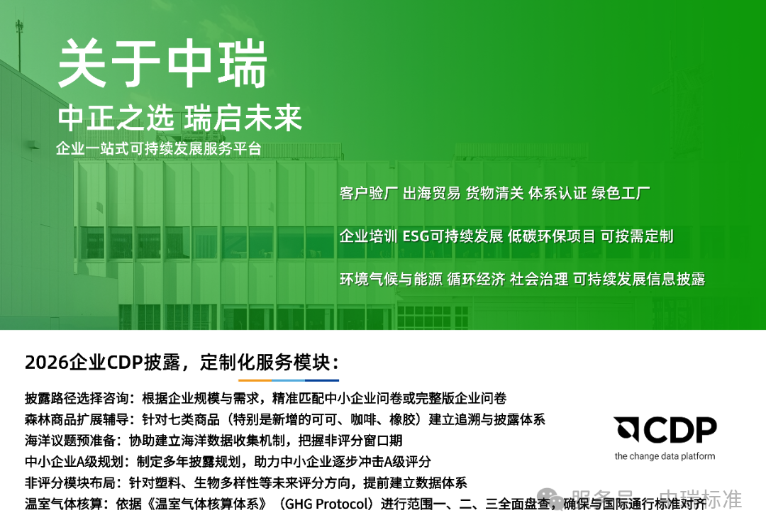 为协助企业应对2026CDP披露相关工作需求,中瑞标准提供以下模块化专业服务,旨在系统性构建企业的可持续披露能力: