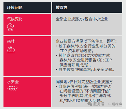 所有企业披露方均需披露气候变化。森林和水安全议题的披露取决于资本市场邀请、供应链成员要求或企业自主选择,且完整版企业还需通过“环境问题评估”自我识别重大影响。