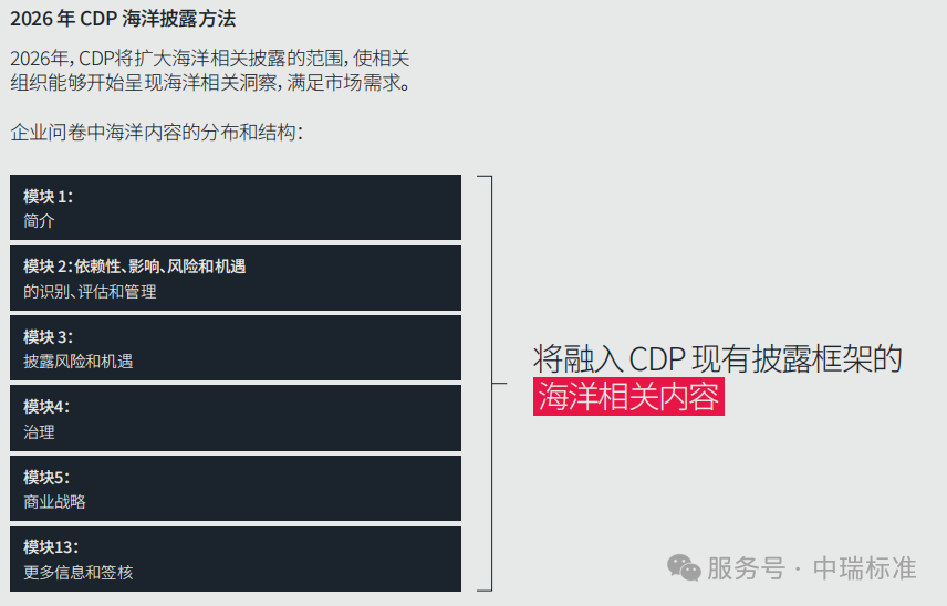 *图:海洋议题在完整版企业问卷中的分布。海洋内容贯穿模块1至模块13,涵盖依赖性、影响、风险机遇识别、治理、战略等多个维度,2026年暂不评分。