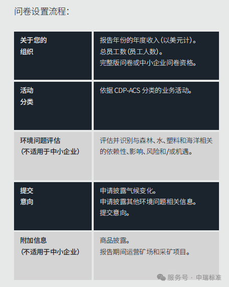 适用企业:大型企业、上市公司、高排放行业企业、供应链核心企业等。此类企业需填写完整版问卷,全面覆盖气候、森林、水安全等核心议题。