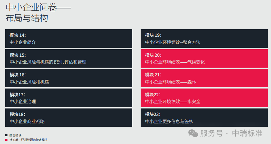 *图:2026年中小企业问卷模块结构。模块14-23涵盖了企业简介、风险机遇识别、治理、商业战略以及各环境议题的绩效模块。其中森林(模块21)和水安全(模块22)为2026年新增的非评分模块。