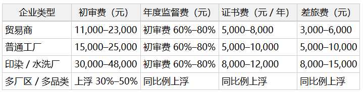 - 印染 / 水洗厂:5–10 万(初审 证书 深度辅导 检测)。
