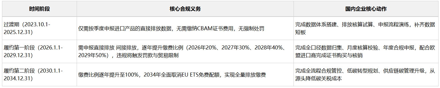 CBAM的实施分为过渡期、分阶段履约期、全面实施期三个阶段,不同阶段企业的合规义务和核心动作完全不同,具体如下表: