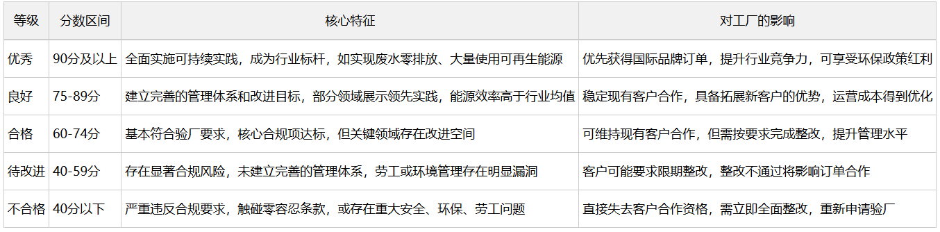 FSLM与社会劳工整合计划(SLCP)深度绑定,采用100分制评分,不设等级划分,但品牌通常要求得分≥70%,核心聚焦劳工权益保障,无有效营业执照直接得0分,存在强迫劳动等严重问题将被标记为高风险,直接影响验厂结果。