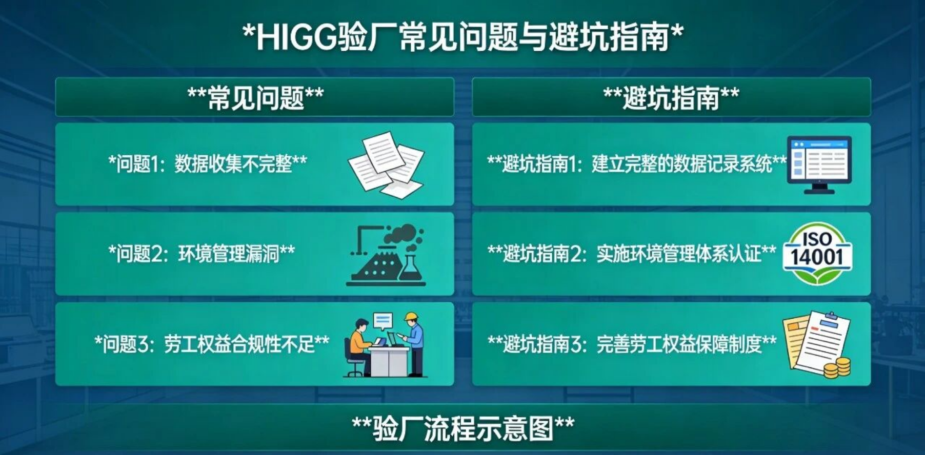 关注新规更新:实时跟踪HIGG验厂规则变化,尤其是FEM模块的优化的要求,避免因不熟悉新规导致验厂失败。