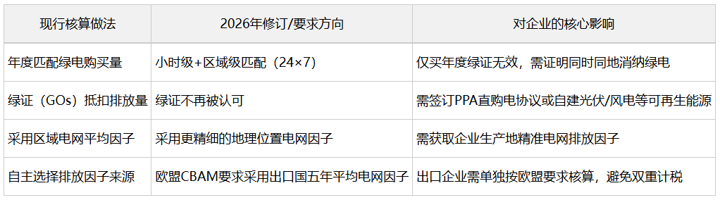 范围二:GHG Protocol正在修订指南,要求小时级/区域级匹配电力消费与排放,绿证(GOs)不再认可,仅PPA直购电、自建可再生能源可抵扣;