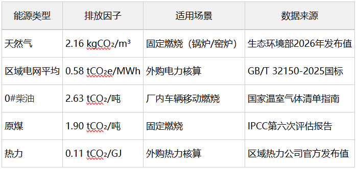 范围一:天然气/煤/柴油排放量 = 消耗量 × 对应燃料官方排放因子