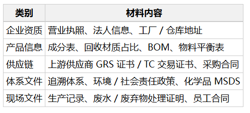 - 附件:GRS 证书 PDF、带 GRS 标识的产品 / 包装图、TC 证书(可选)