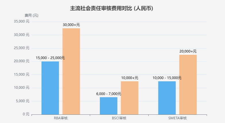 从图表可以看出,RBA审核费用相对较高,小型工厂的费用通常在1.5万至2.5万元人民币之间,而大型工厂则可能超过3万元人民币。相比之下,BSCI审核费用较低,小型工厂约为6,000–7,000元,大型工厂约为1万元左右。SMETA审核的费用则介于两者之间,小型工厂约为1万–1.5万元,大型工厂约为2万元左右。