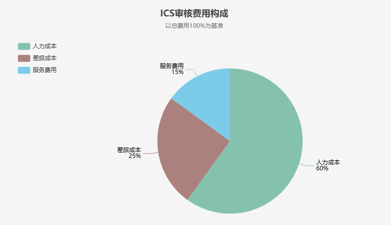 ICS审核的费用因项目规模、审核范围和执行机构等因素而异,一般由人力成本、差旅成本和服务费用三部分构成。下图展示了ICS审核费用的主要构成: