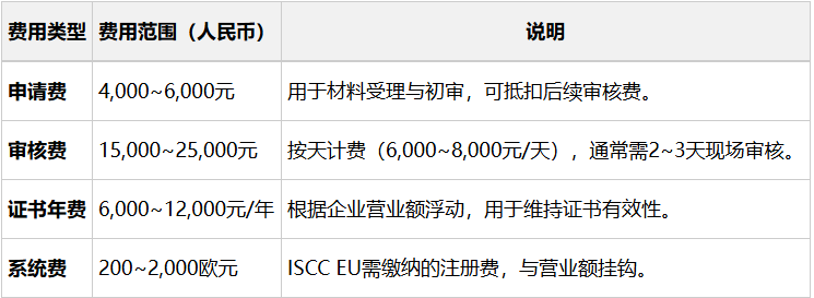 ISCC认证费用由基础费用和附加服务构成,具体因认证类型、企业规模及供应链复杂度而异: