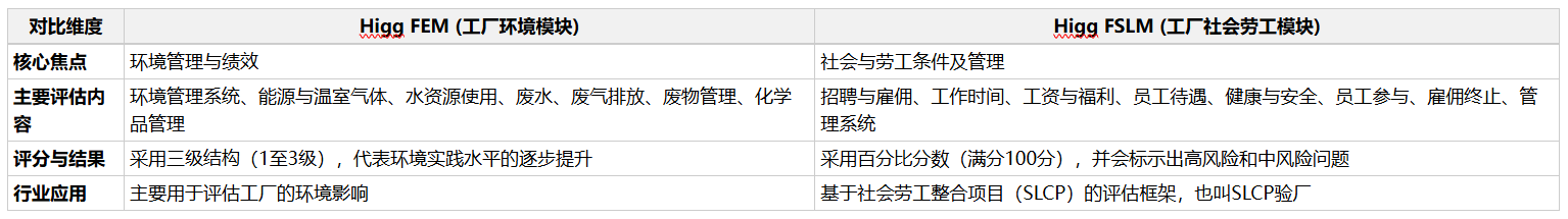 Higg FEM和Higg FSLM是服装、鞋类和纺织行业两个核心的可持续性评估工具,用于工厂的自我评估和改善。简单来说,Higg FEM主要关注工厂的“环境”表现,而Higg FSLM则聚焦于“社会与劳工”条件。它们都致力于通过标准化的评估,帮助工厂减少重复审核,推动持续改进。