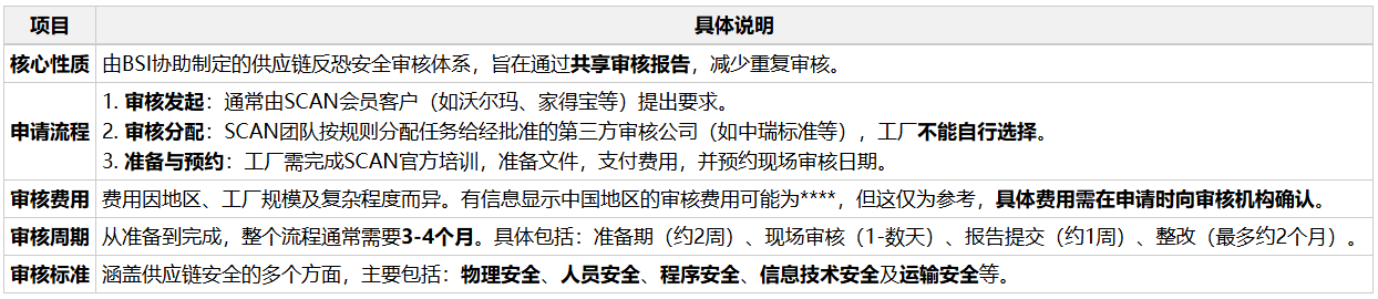SCAN(供应商合规审核网络)审核的申请和准备涉及不少细节,下面我将申请流程、费用、周期和审核标准等关键信息整理成了一个清晰的表格,方便你快速了解。