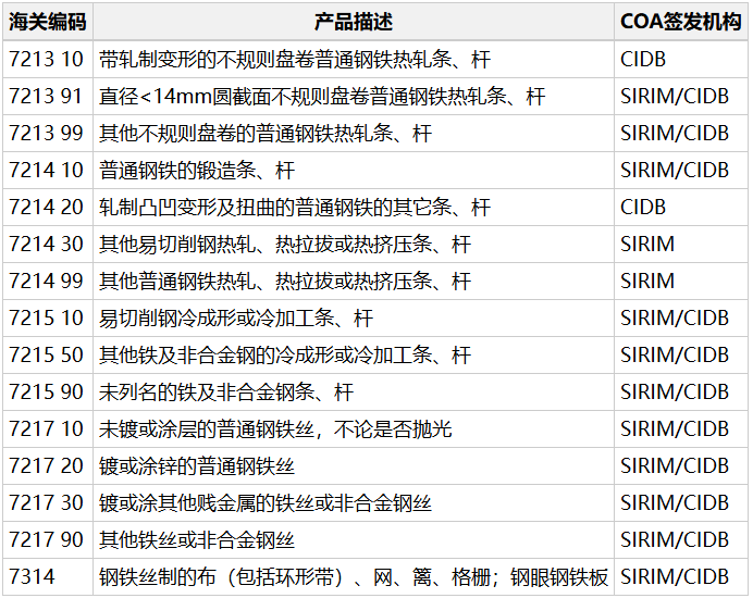 马来西亚政府于2025年9月15日发布公告,对进口钢铁产品的证书批准(Certificate of Approval, COA)机制进行改进 。根据该公告,自2025年10月1日起,马来西亚投资、贸易与工业部(MITI)将对钢棒、盘条、冷拔棒材、线材、钢丝绳、钢绞线、铁丝网 等长型钢铁产品实施新的加强要求 。这些产品的海关编码(HS Code)主要涉及7213、7214、7215、7217、7314 等税号,具体产品范围如下: