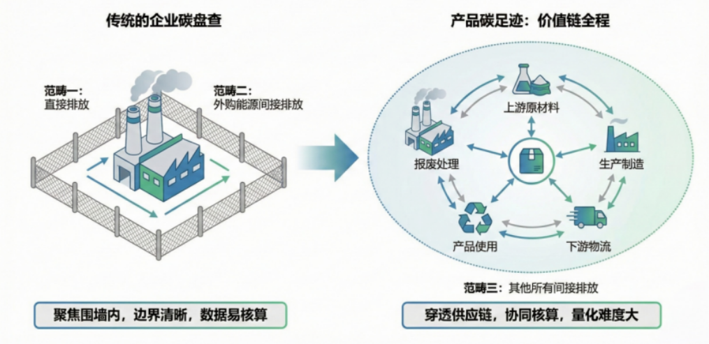传统的企业碳盘查,主要聚焦于企业拥有或控制的排放源,即国际通称的范畴一(直接排放,如燃料燃烧)和范畴二(外购电力、热力等能源的间接排放)。其边界清晰,数据多源于企业内部,相对容易核算。