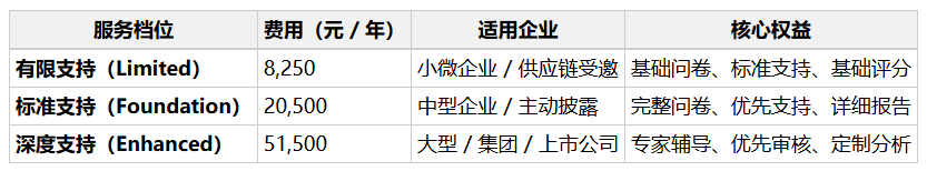 - 咨询辅导费:1–5 万(差距诊断、数据核算、问卷优化、TCFD 对齐、申诉)。