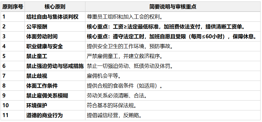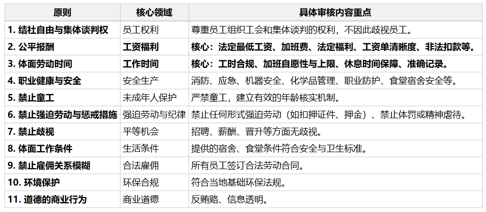 BSCI行为准则围绕以下11项原则构建审核框架。你可以对照下表了解各模块的关注点: