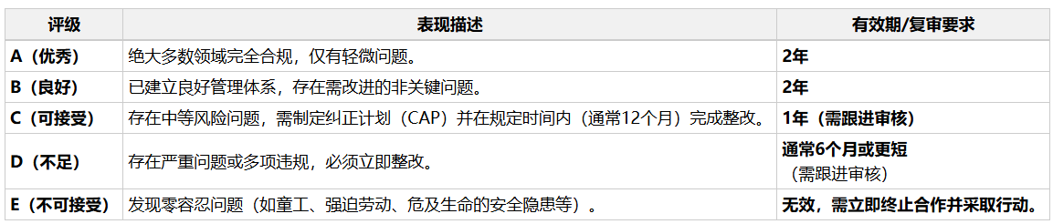 BSCI不设“通过”或“不通过”,而是根据审核发现的问题严重性和数量,给出一个从A到E的评级,并规定不同的复审周期,以驱动持续改进: